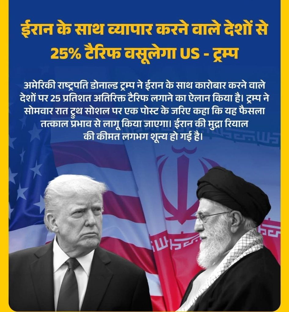 अमेरिकी राष्ट्रपति ट्रंप ने ट्रुथ सोशल पर पोस्ट करते हुए कहा कि जो भी देश इस्लामिक रिपब्लिक ऑफ ईरान के साथ व्यापार करेगा, उसे अमेरिका के साथ किए जाने वाले किसी भी व्यापार पर 25 प्रतिशत टैरिफ देना होगा। यह आदेश तत्काल लागू होकर अंतिम और निर्णायक है।