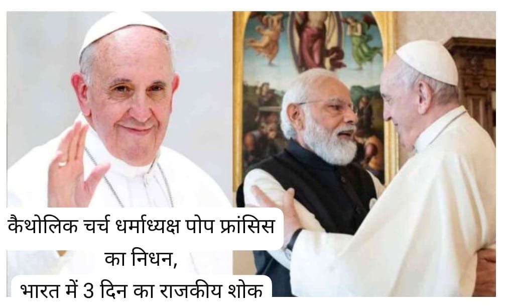 भारत ने सोमवार को पोप फ्रांसिस के निधन पर सम्मान के तौर पर दिवसीय राजकीय शोक की घोषणा की है। राजकीय शोक की अवधि के दौरान, पूरे भारत में उन सभी इमारतों पर राष्ट्रीय ध्वज आधा झुका रहेगा, जहाँ नियमित रूप से राष्ट्रीय ध्वज फहराया जाता है और कोई आधिकारिक मनोरंजन नहीं होगा।