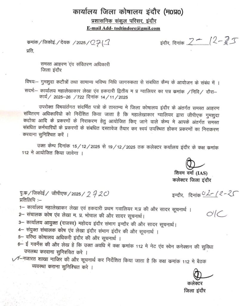 महालेखाकार लेखा एवं हकदारी, ग्वालियर द्वारा जारी पत्र के अनुसरण में जिला कोषालय ने सभी आहरण एवं संवितरण अधिकारियों को निर्देशित किया है कि वे अपने-अपने विभागों के सभी संबंधित कर्मचारियों के जीपीएफ गुमशुदा कटौती एवं अन्य लंबित प्रकरणों के दस्तावेज पूर्ण कर स्वयं कैंप में उपस्थित हों। कैंप का उद्देश्य वर्षों से लंबित प्रकरणों का स्थल पर ही निराकरण सुनिश्चित करना है,जिससे कर्मचारियों को समय पर लाभ मिल सके।