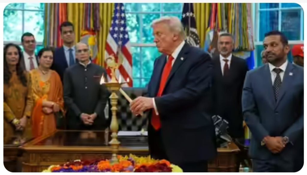 नई दिल्ली । अमेरिका के राष्ट्रपति डोनाल्ड ट्रम्प ने 21 अक्तूबर, 2025 (स्थानीय समयानुसार) व्हाइट हाउस में दिवाली समारोह में भाग लिया और भारत और भारतीय-अमेरिकियों को हार्दिक शुभकामनाएँ दीं। कार्यक्रम में ट्रम्प ने प्रधानमंत्री नरेंद्र मोदी की प्रशंसा करते हुए उन्हें एक “महान व्यक्ति” और “महान मित्र” कहा तथा व्यापार और क्षेत्रीय शांति जैसे विषयों पर संक्षिप्त रूप से प्रकाश डाला।