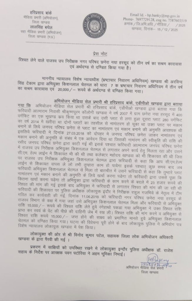 खंडवा। रिश्वत लेने के मामले में दोषी पाए गए नगर परिषद छनेरा के तत्कालीन राजस्व उप निरीक्षक किशनलाल चेतनमल को न्यायालय ने तीन वर्ष के सश्रम कारावास एवं ₹20 हजार के अर्थदंड से दंडित किया है। यह फैसला भ्रष्टाचार निवारण अधिनियम के तहत विशेष न्यायालय (लोकायुक्त) खंडवा द्वारा सुनाया गया।